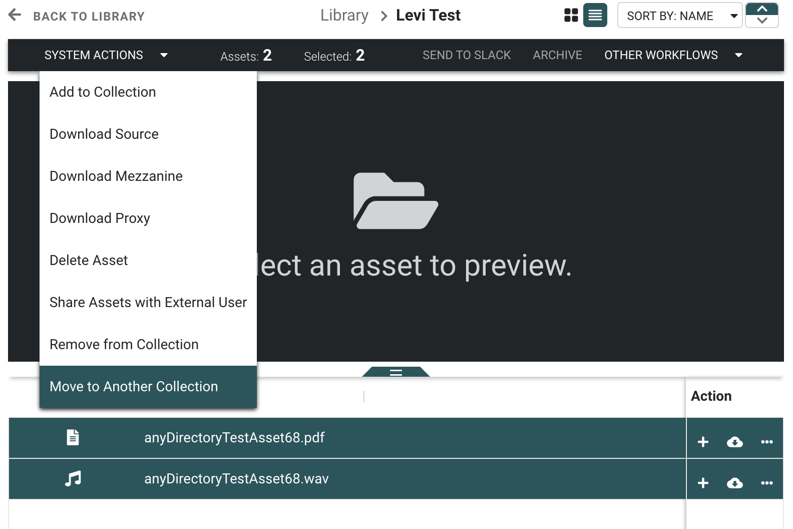 To take an action on multiple assets, select the assets, select the + icon above the preview window, then select the relevant action.