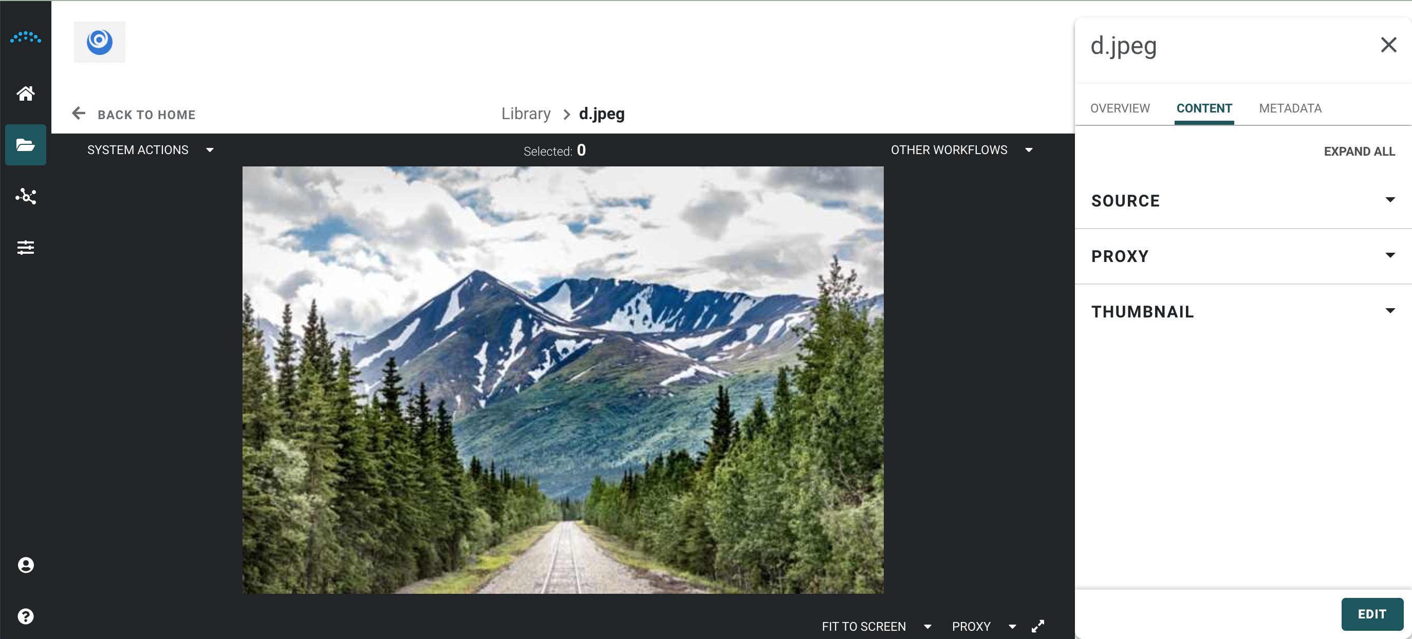 When an Image asset is opened, image details, the proxy version of the image, and source content are displayed in the inspector panel, allowing them to take image-specific action on the asset.